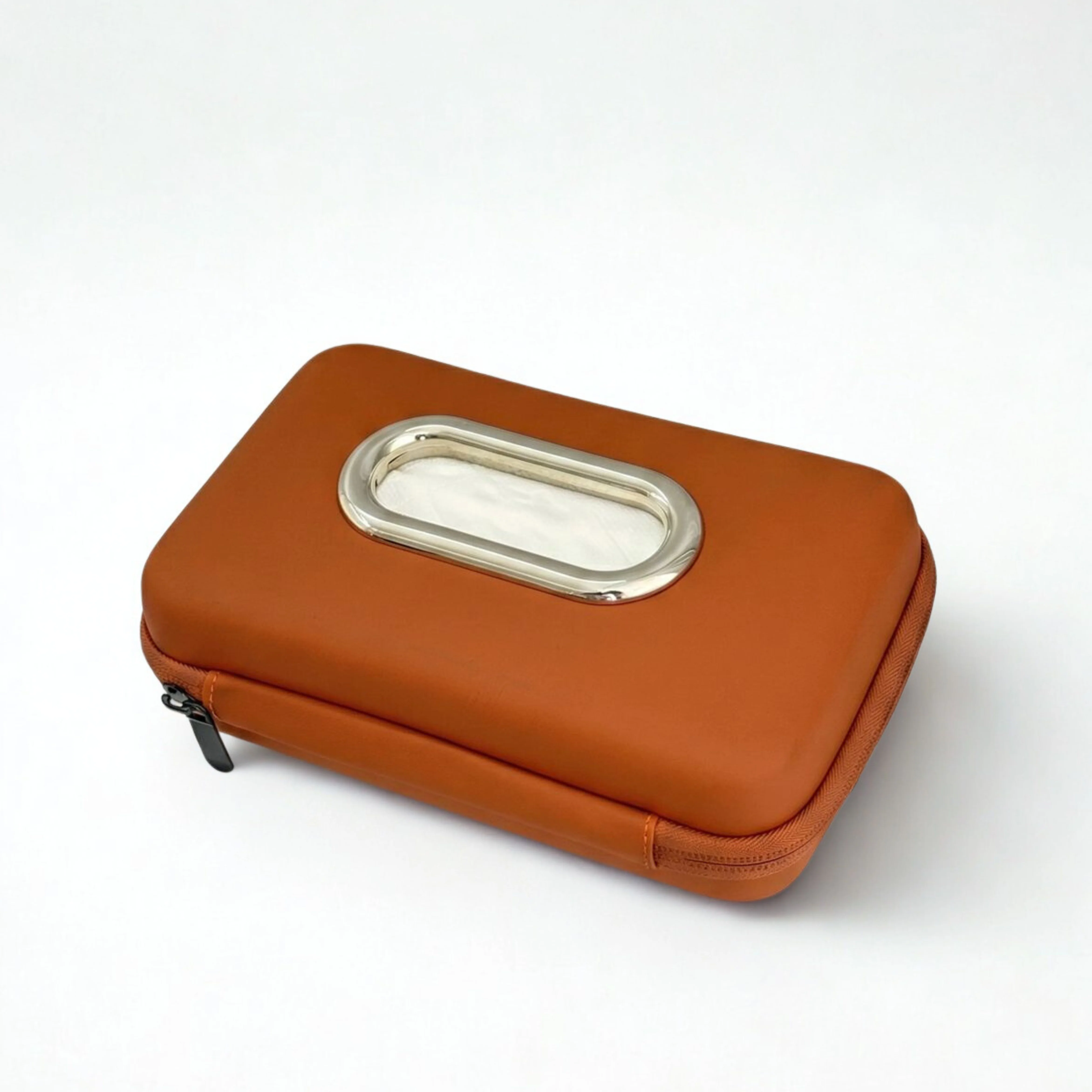 The chrome-finish oval pull window ensures smooth, controlled dispensing with one hand, while the zippered design makes refilling quick and hassle-free. Its compact structure fits perfectly behind the headrest, on the dashboard, or center console, keeping tissues within easy reach for both driver and passengers.