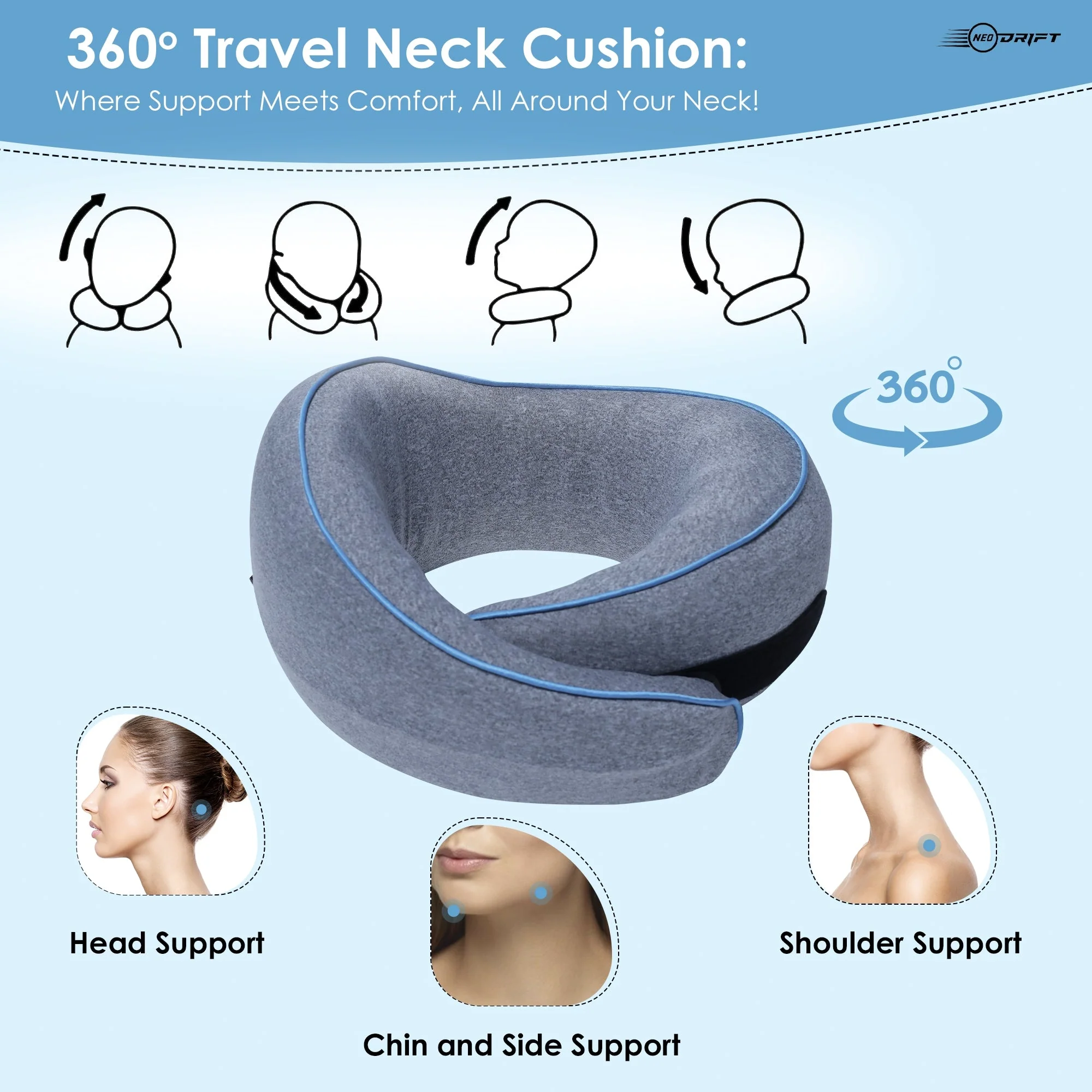 Discover the ultimate in travel comfort with the Neodrift 'TravelNeck' Series, featuring memory foam neck pillows designed to transform your travel experience. Whether you're taking a long flight, embarking on a road trip, or enjoying a train journey, the TravelNeck Pillow provides exceptional neck support and relaxation. Crafted from high-quality memory foam, this pillow contours perfectly to your neck, relieving discomfort and promoting proper spinal alignment. Say goodbye to travel-related neck pain and hello to a new level of comfort. The TravelNeck Pillow combines style and functionality, ensuring that you enjoy a luxurious travel experience every time. With its sleek design and ergonomic support, this pillow is the perfect travel companion for those who prioritize comfort, relaxation, and durability.